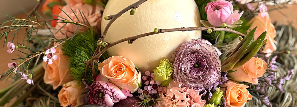 Hooi gebonden krans met struisvogelei en voorjaarsbloemen 🌸 We maken samen een voorjaarsstuk met verse materialen in lentevibes! 🌸 We gaan ook genieten van een beetje me-time in een leuk kader: een drankje in de ene hand en de mooiste bloemen in de andere.